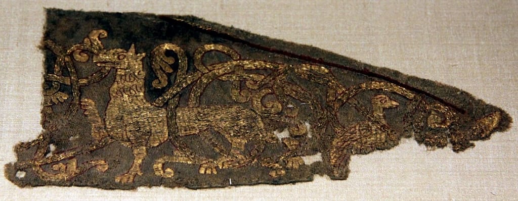 Fragments (Figure 3 and Figure 4) of the beautifully embroidered shoes of a bishop named William, who was interred at Périgueux Cathedral, are now dispersed over three museums (Musée de Cluny Cl. 12113, Musée des Arts Décoratives 16325, and Musée des Tissus MT 25078 & MT 25079). They were made in the 12th century, before AD 1173, in either England or France. The single threads of gold foil wrapped around a silk core are couched on samite. The design consists of animals amidst scrolling foliage.