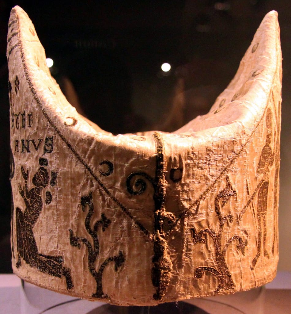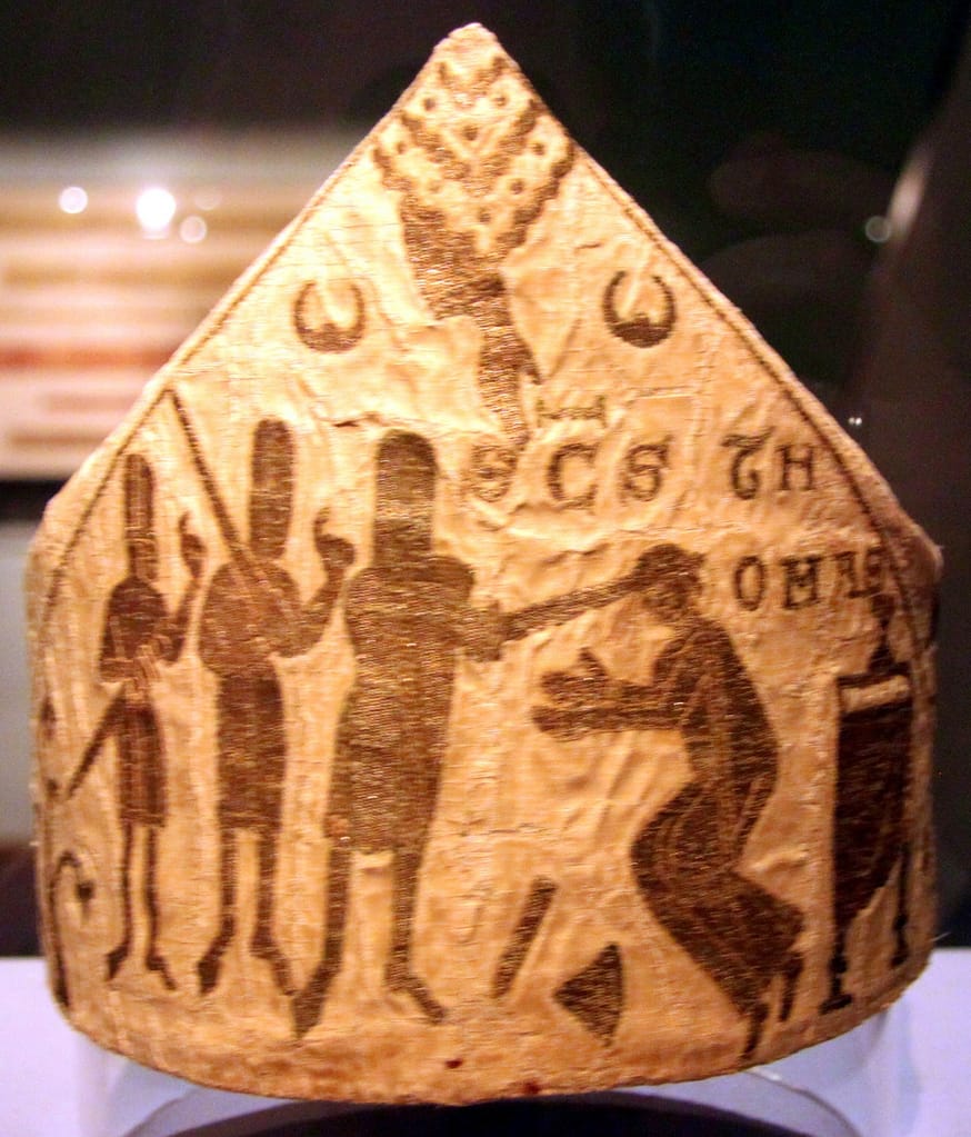 Mitres also survived surprisingly well. They can be found in Cathedral treasuries all over Europe. They were often found when a tomb of a clergyman was opened in the 18th or 19th century. Several mitres are held in museum collections all over Europe that look remarkably similar. They are relatively small, as was the fashion at the time, and they depict the martyrdom of Thomas Becket (AD 1119/20-1170) and/or that of Saint Lawrence and Saint Stephen. Becket was the archbishop of Canterbury, who was murdered in his church by knights due to a conflict with Henry II (AD 1133-1189). He soon became a saint. These mitres likely were produced at a somewhat larger scale in England to foster the cult of Saint Thomas Becket (Blöcher, 2010, 2012). With pilgrims coming to Canterbury being an important economic factor.