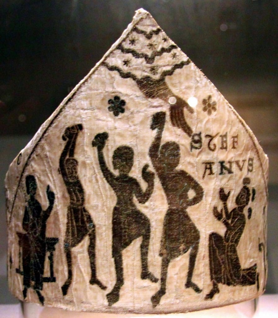 Mitres also survived surprisingly well. They can be found in Cathedral treasuries all over Europe. They were often found when a tomb of a clergyman was opened in the 18th or 19th century. Several mitres are held in museum collections all over Europe that look remarkably similar. They are relatively small, as was the fashion at the time, and they depict the martyrdom of Thomas Becket (AD 1119/20-1170) and/or that of Saint Lawrence and Saint Stephen. Becket was the archbishop of Canterbury, who was murdered in his church by knights due to a conflict with Henry II (AD 1133-1189). He soon became a saint. These mitres likely were produced at a somewhat larger scale in England to foster the cult of Saint Thomas Becket (Blöcher, 2010, 2012). With pilgrims coming to Canterbury being an important economic factor.
