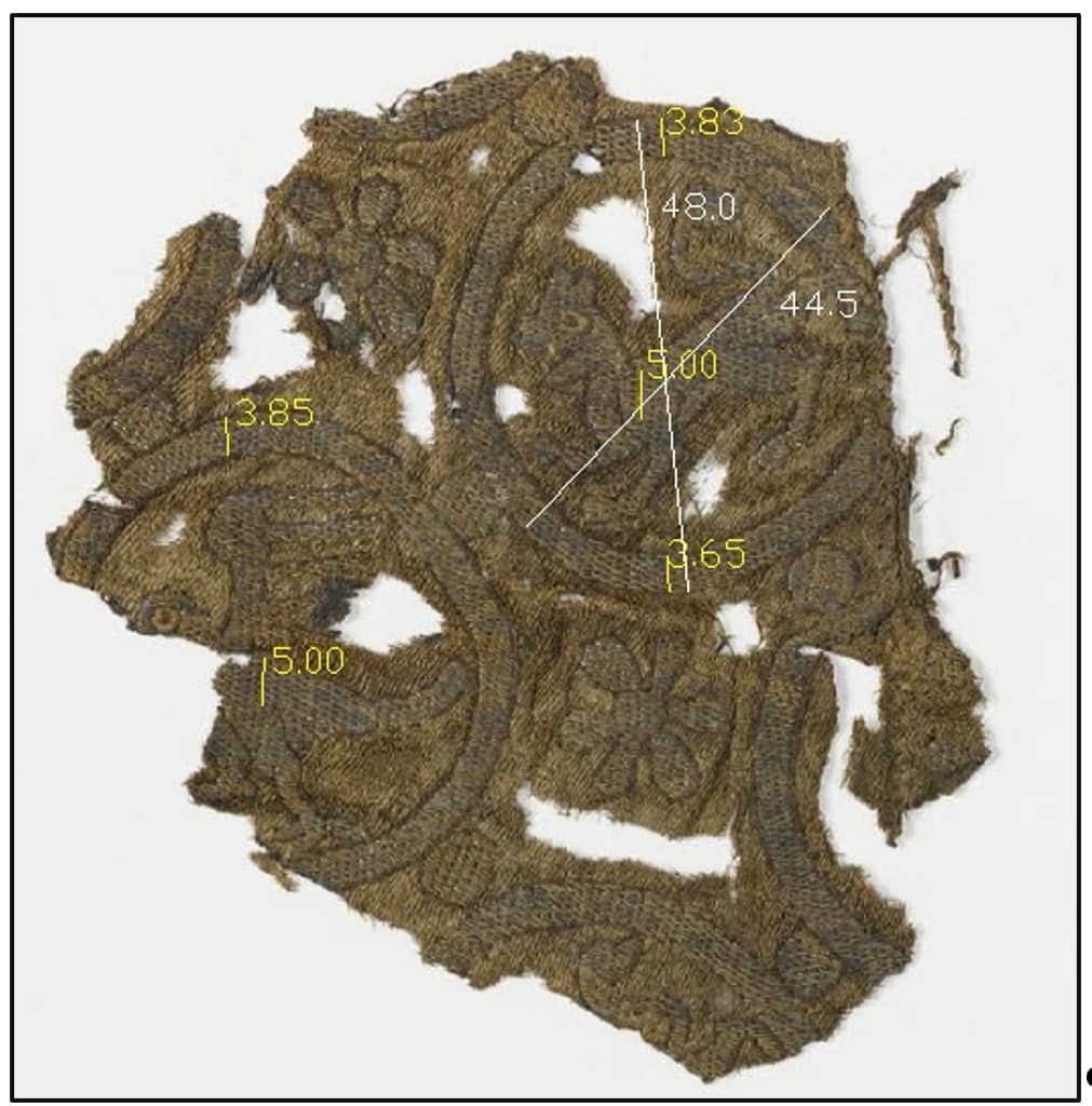Determining the size of the goldthread used required careful measuring and counting on a picture of the sample (Figure 11). On average, 29 parallel goldthreads are needed to cover a centimetre. Experiments with Stech 70/80 showed that 29 parallel threads only covered 0.9 cm. Repeating the experiment with Stech 80/90 resulted in 30 parallel threads covering a centimetre—close enough.