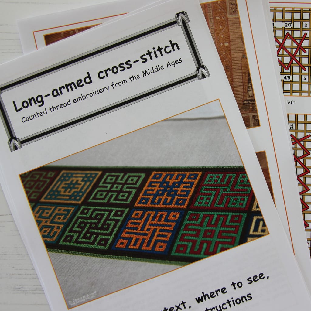 Patterns based on a 12th-century chasuble from St. Blaise in Germany (now kept in St. Paul im Lavanttal, Austria). This particular chasuble is completely stitched in long-armed cross-stitch – the precursor of our modern cross-stitch.