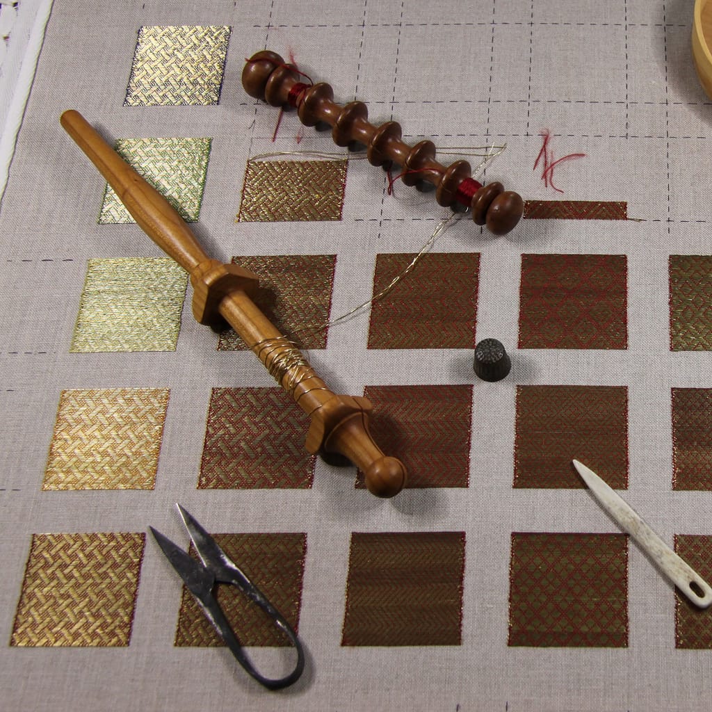 When I demonstrate diaper pattern couching, people always ask if I have the complete pattern in my head, since there is nothing drawn or printed on the fabric. And even with my explanation, people don’t always fully understand how it is done. So, let me explain how I do it.