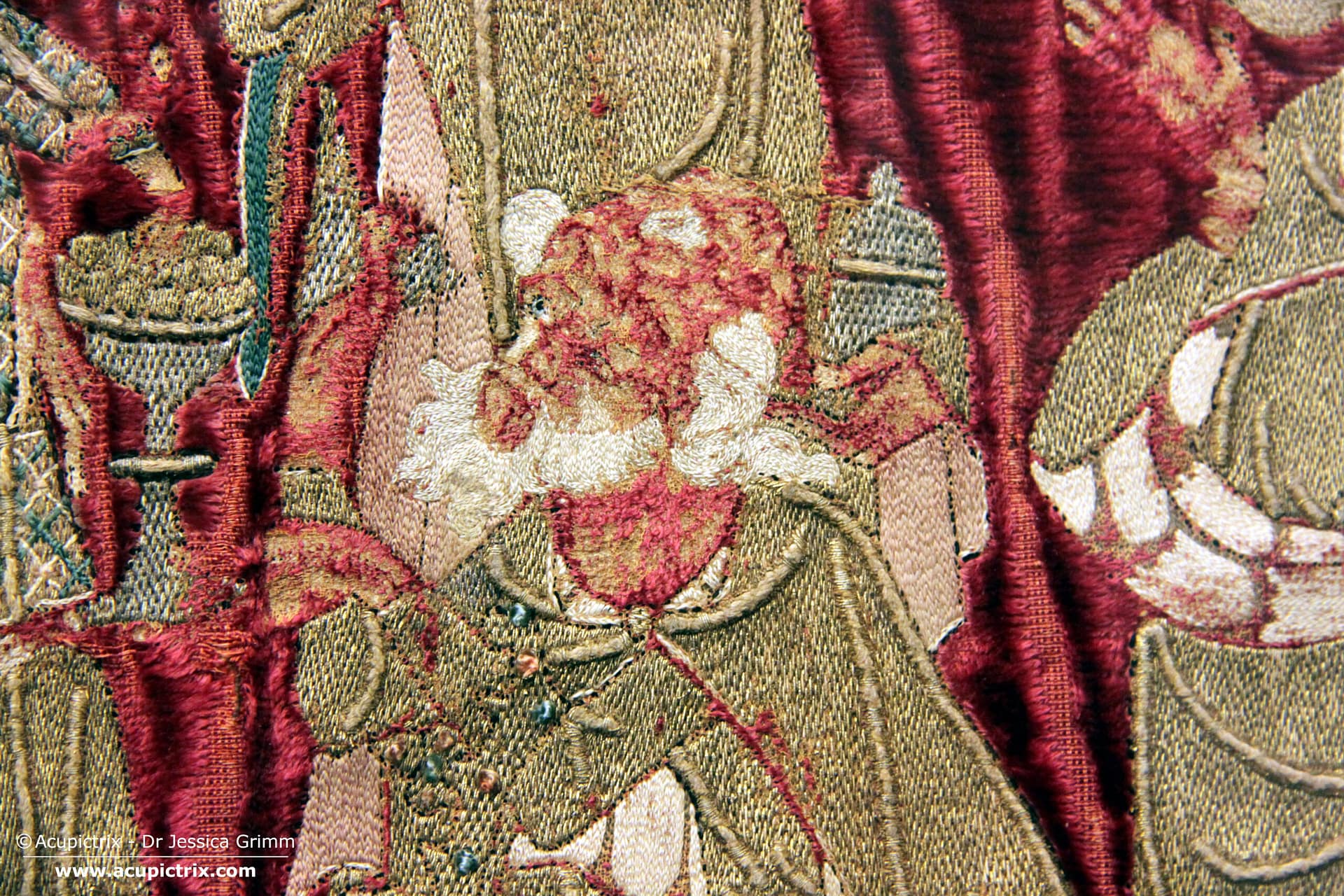 The embroidery on the Vic Cope is classic Opus anglicanum: directional split stitch and underside couched metal threads. The underside couching uses simple bricking and a chevron pattern. In addition, the embroidery on the Vic Cope uses linen string padding to accentuate the clothing’s folds. To stitch on the red velvet, it was backed with linen (38 x 45 ct) and covered with a thin silken fabric, which was carefully cut away once the embroidery was completed. Stitching directly onto the velvet without this layer is impossible, as the velvet’s hairs will interfere with the stitching.