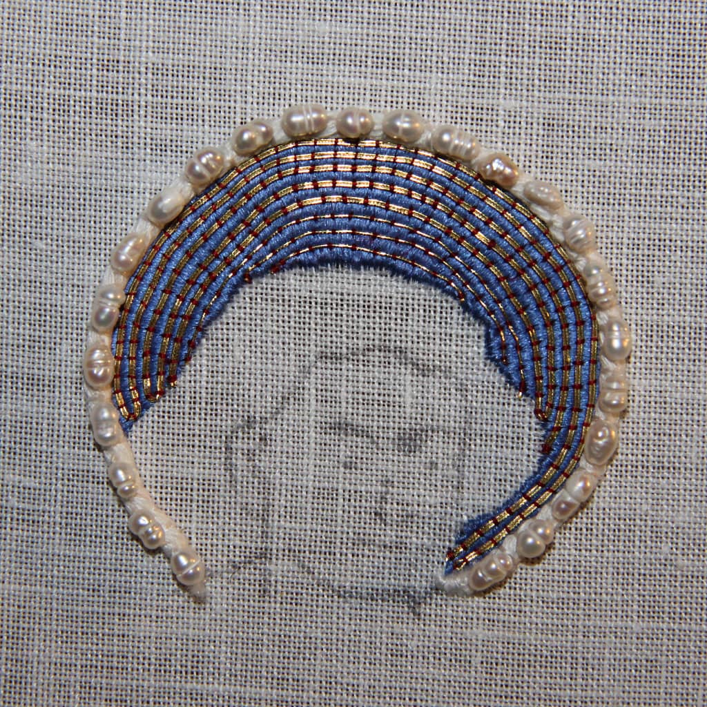 under beading with freshwater pearls. It is often the only thing that remains of the original beading. The design comes from an orphrey on a chasuble cross kept at the Dommuseum Frankfurt.